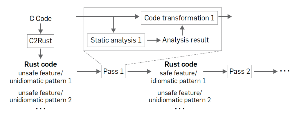 Figure 1. Improving C2Rust-translated code by replacing unsafe features and unidiomatic patterns.