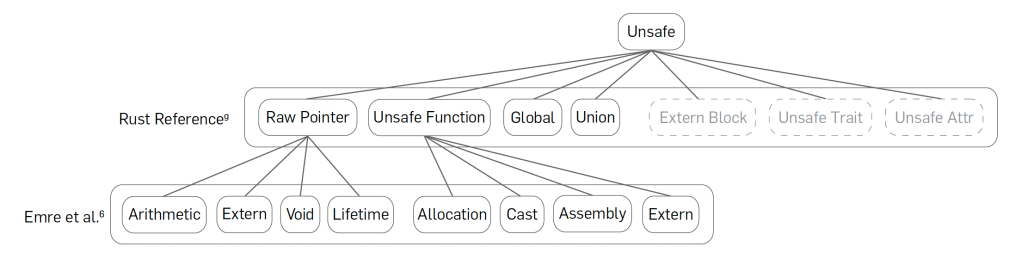 Additionally, as shown in the third row, Emre et al.6 further classify certain unsafe features. They categorize raw pointers into arithmetic pointers, extern pointers, void pointers, and lifetime pointers. Arithmetic pointers are those used in pointer arithmetic, extern pointers are those passed to or returned from extern functions, and void pointers are cast from or to void *. Lifetime pointers include all raw pointers not in the other categories. They also categorize unsafe functions into allocation functions, casts, assembly, and extern functions. Allocation functions include malloc and free, casts refer to unsafe casting through std::mem::transmute, and assembly refers to the use of inline assembly code. Extern functions cover all functions not classified elsewhere, mainly those in libc. By definition, their classification is exhaustive.
