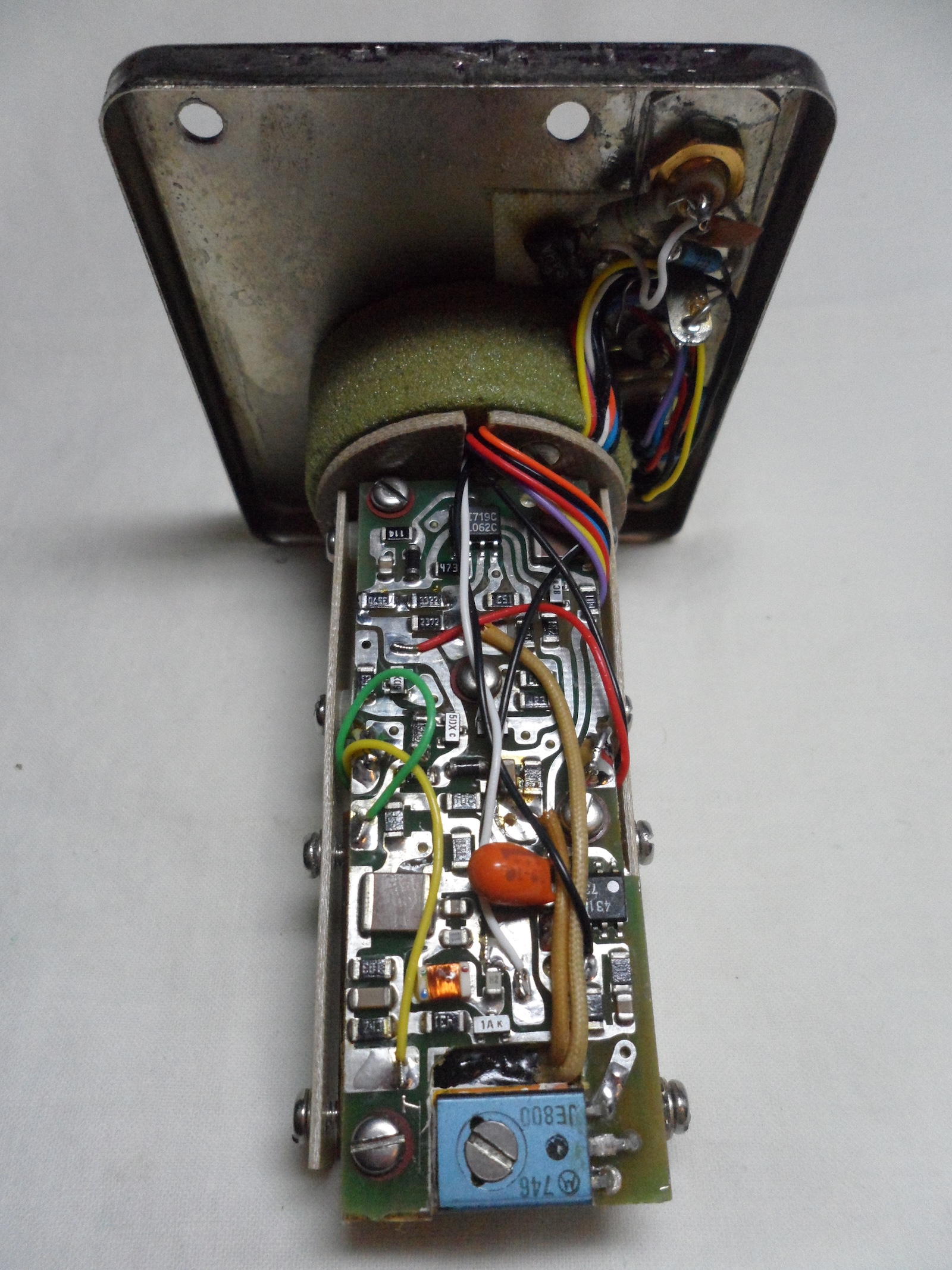 The blue component at the bottom is a Motorola JE800 Darlington transistor that is used as heating element. Closeby, to the right of the orange capacitor, is an IC with 431 marking. It’s tempting at first to speculate that this is a TMP431 temperature sensor, , but since those require a microcontroller to configure that’s unlikely. Maybe it’s TL431 voltage reference instead? Either way, there must be something on the PCB to measure voltage and feed that back to the heating transistor to keep temperature stable.