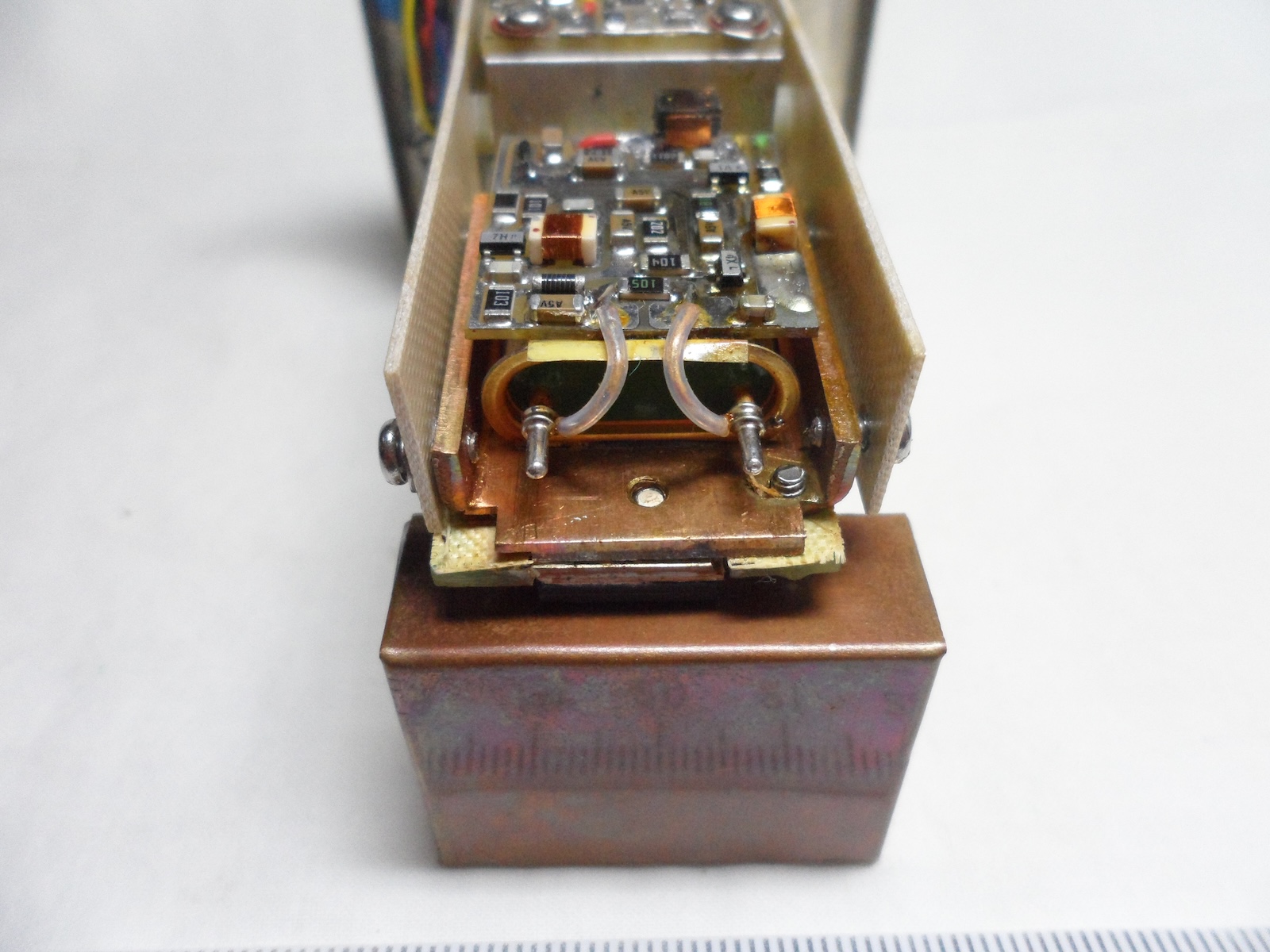 After removing the copper heatsink, you can see the oscillator control board on top of a large crystal: