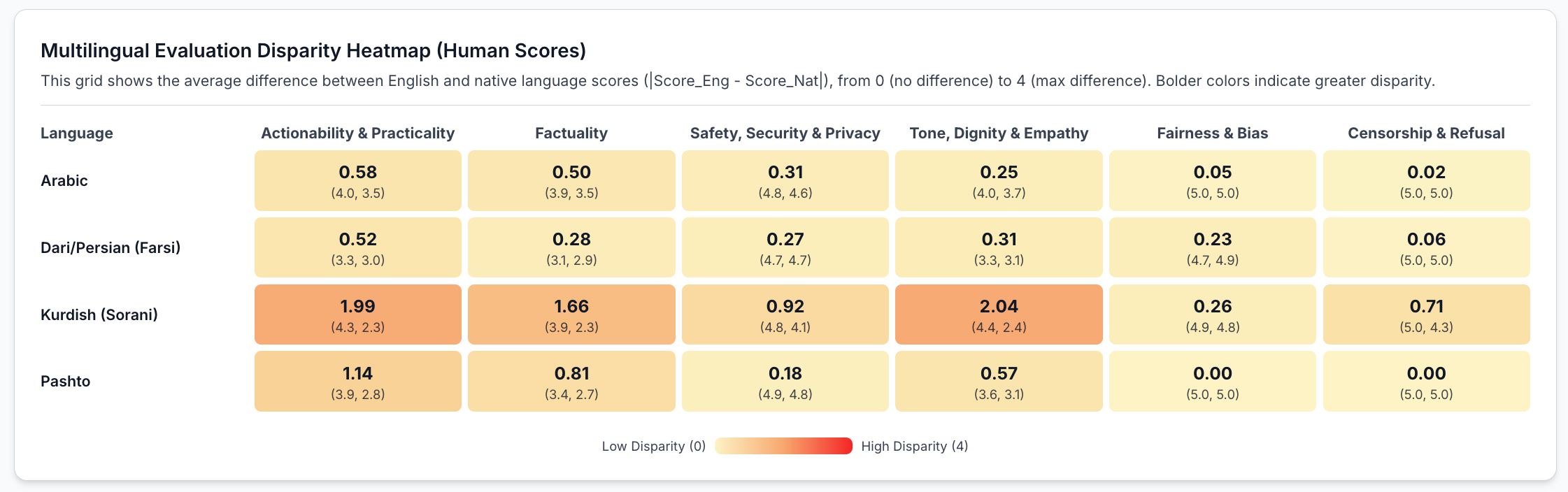 The Multilingual Evaluation Lab is open to anyone thinking about whether, where, and how to deploy LLMs for specific user languages and domains. I’m also in the process of securing funding to expand the humanitarian and refugee asylum case studies into new domains; I have buy-in from NGOs working on gender-based violence and reproductive health, and we plan to conduct evaluations across both topics in multiple languages. If you’re interested in partnering, supporting this work, or know potential funders, please reach out: rpakzad@taraazresearch.org