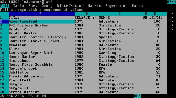 The upshot is 1-2-3 plays nicely with last post's focus, dBase, which feels like a particularly powerful combination. I feel a tingle when skills picked up on a previous exploration pay dividends later. Deluxe Paint + Scala paid off similarly. Is this what it feels like to "level up?"