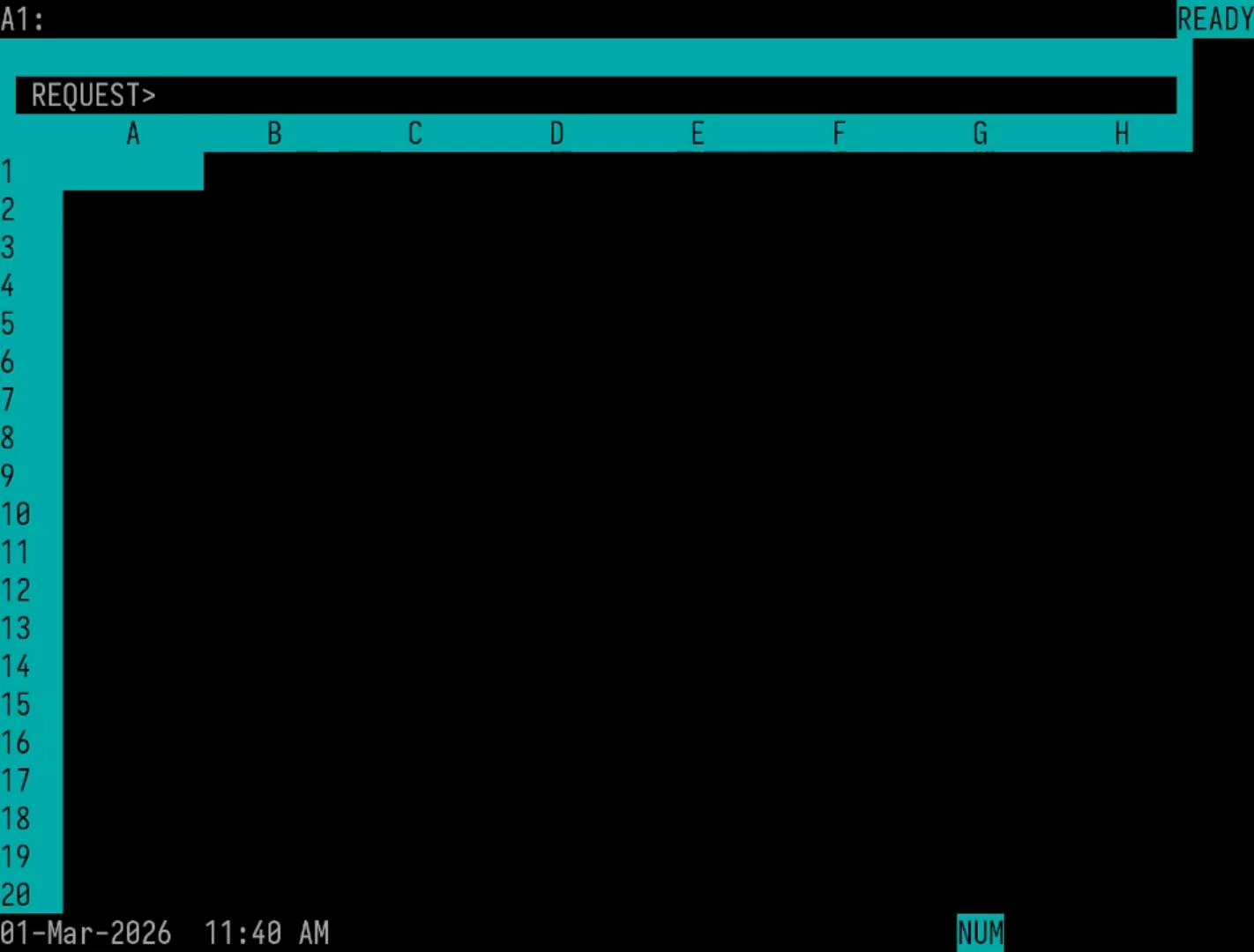 We gain a lot, but there is a notable absence: the upper-right status check. VisiCalc shows calculation order, arrow-key toggle, and free memory in that spot. Those are all gone in 1-2-3 and good riddance, frankly. On the PC I have full arrow keys and more RAM than Woz; 1-2-3 sees my full 16MB of DOS Extended memory. There is no stopping me.