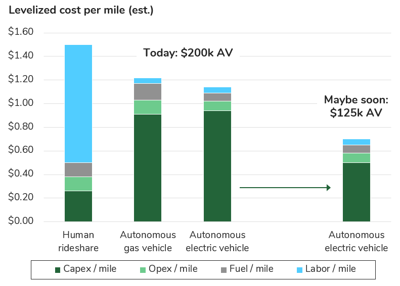 Autonomous vehicles are generally going to be high-utilization vehicles. That’s true because they can be, but also because they need to be in order to justify such high capex. This is an ideal scenario for the electric drivetrain, which has lower maintenance and lower energy costs than the internal combustion engine.1 The more a vehicle is utilized, the more these operational advantages matter when it comes to the total cost of ownership. Additionally, all of those expensive sensors and chips which need to be packed into an AV also need to be powered, which compounds the efficiency advantage of going electric. It’s just silly to contemplate running 13 cameras, 4 LiDAR units, 6 radar units and multiple GPUs on an internal combustion engine.