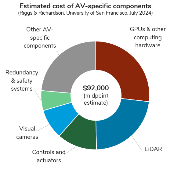 Human labor is by far the most expensive input to any kind of taxi or rideshare business, so the economic pitch for autonomous vehicles sounds pretty straightforward: get rid of the driver. Yet, in reality, the story is more complicated, because the equipment required to make a vehicle autonomous is very expensive. For example, Waymo’s 6th generation sensor kit includes 13 cameras, 4 LiDAR units, and 6 radar units. A recent paper from the University of San Francisco added up the total cost of these sensors, plus high performance computing hardware, and other ancillary systems. The result is a total cost estimate of $167,160… but the authors end up concluding that “total vehicle costs are likely $200,000 or more”.