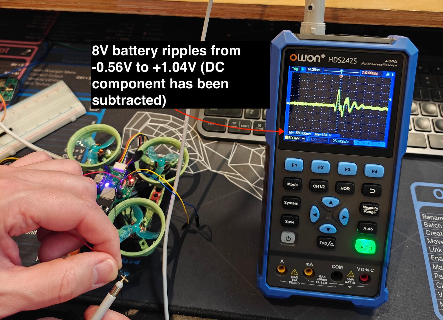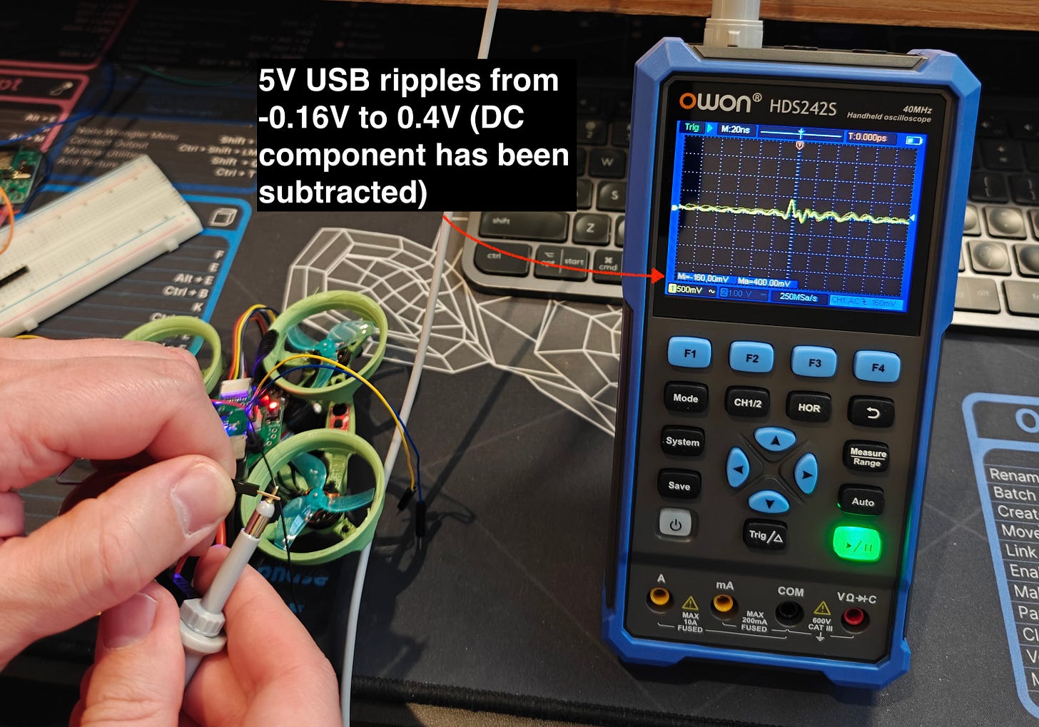 This switching causes ripples in the voltage line, and if we hook up an oscilloscope to the line we should be able to see these ripples in detail.