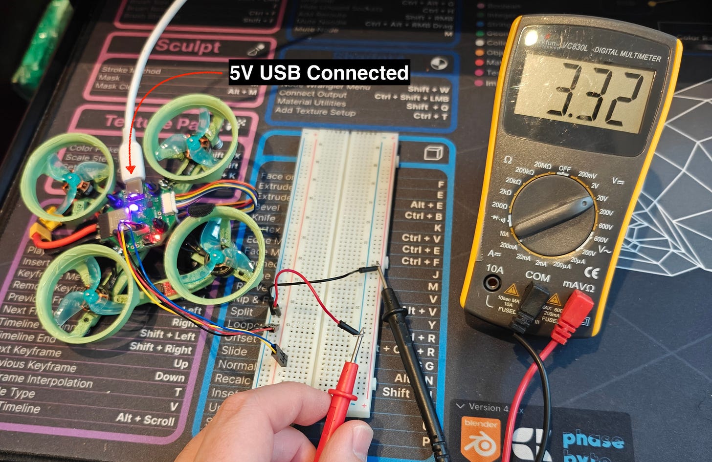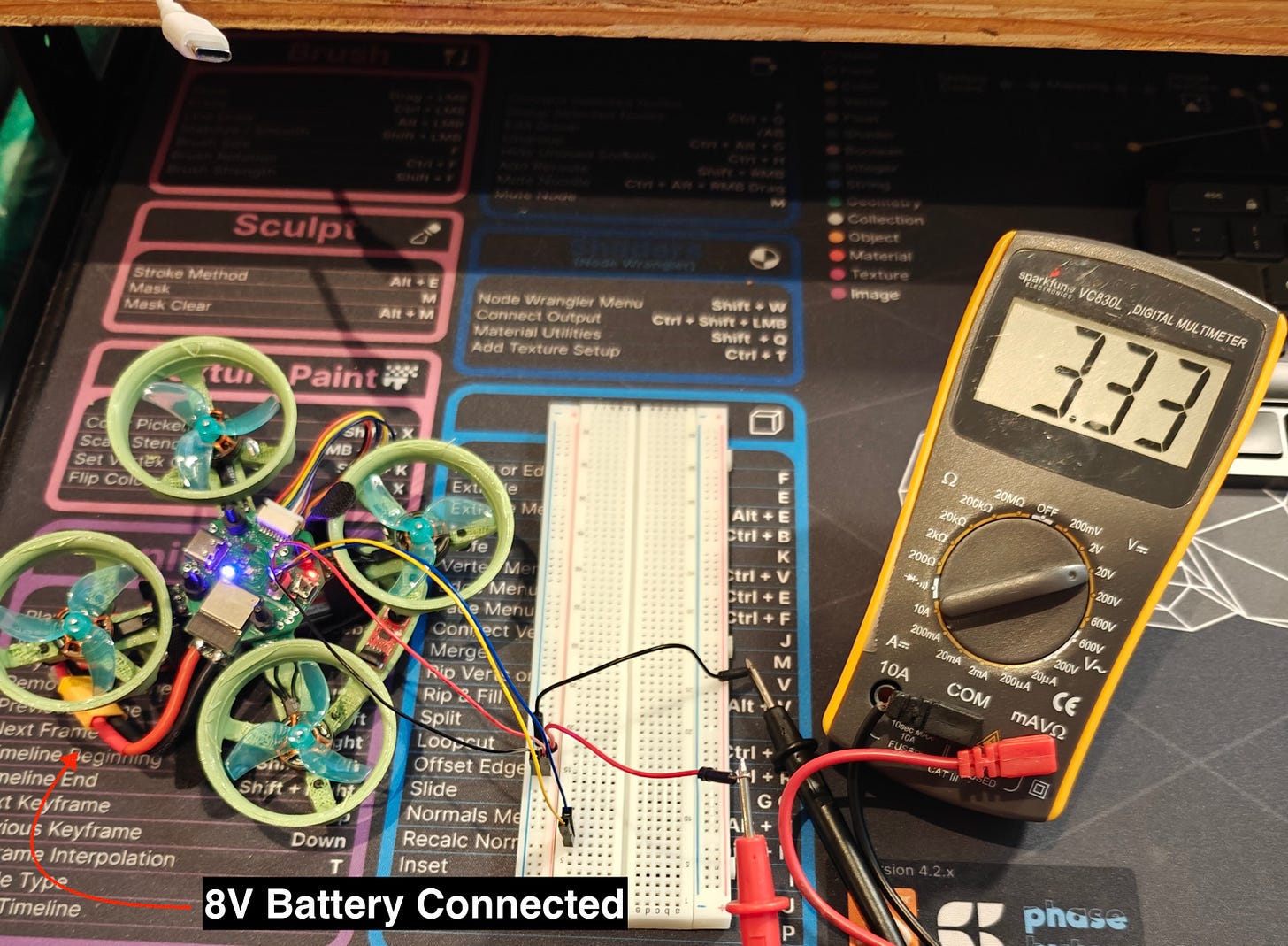 A Qwiic connector gives me easy access to the 3.3V bus. Here you can see it’s reading a pretty steady 3.3V