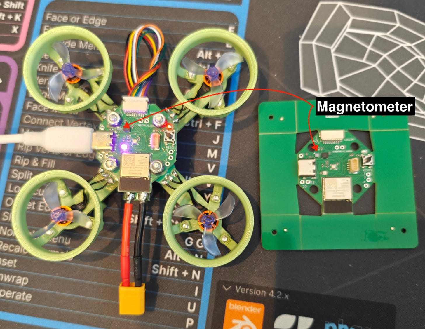 Eventually I had to plug my drone into the battery that would power it in flight, and all of a sudden the magnetometer stopped working completely. I pivoted back to it in an effort to debug it, but nothing worked. I tried to reset the board, I tried to add the code to automatically reset and reinitialize the magnetometer if I hadn’t heard from it for a while, but no matter what I tried it would stay dead when the battery was plugged in.